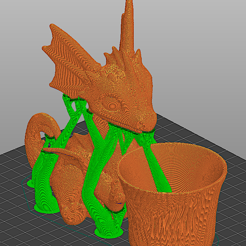 Шаг 3: Если нужно, то в слайсере автоматически или вручную создаются поддержки — вот эти древовидные структуры. Они нужны для тех элементов фигурки, которые «висят в воздухе» — например, отведённая в сторону рука, козырёк кепки, арочный мостик или мордочка дракона. Принтер не может печатать пластиком в воздухе, поэтому ему нужны «строительные леса» для опоры. После печати поддержка аккуратно удаляется с фигурки.